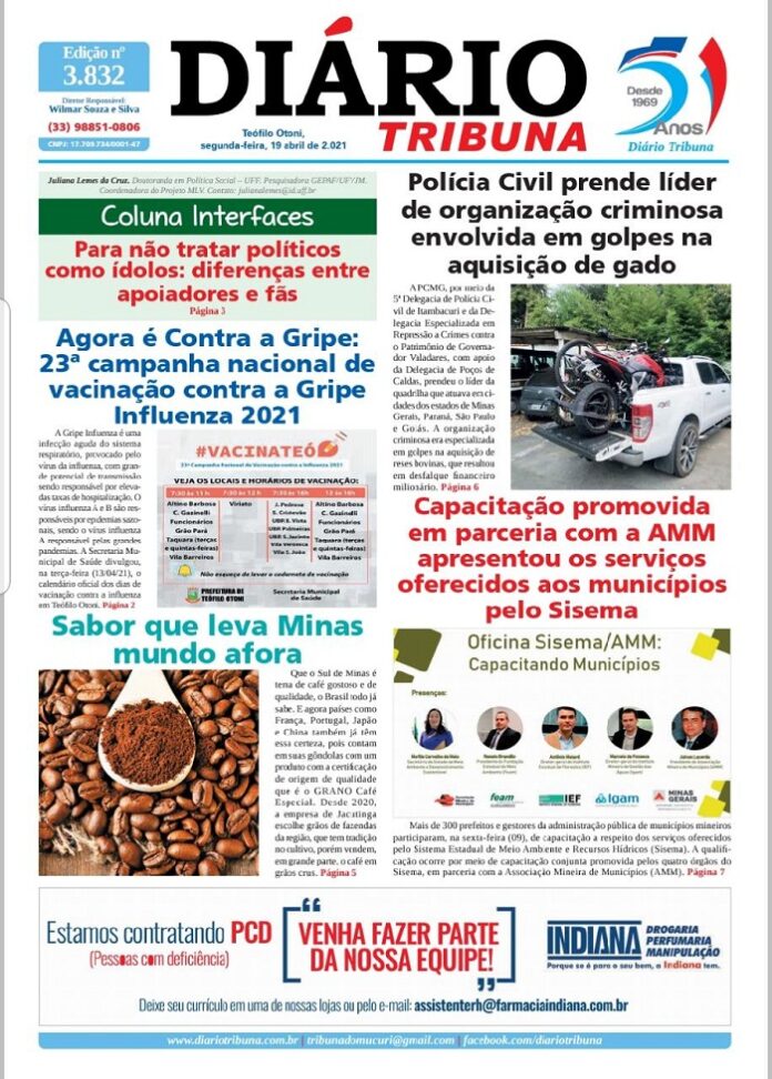 Diário Tribuna, 19 de Abril 2021, Teófilo Otoni – MG Por diariotribuna - 19/04/2021 0 899 Facebook Twitter Google+ Pinterest WhatsApp Acesse o link abaixo e veja a edição completa do Diário Tribuna desta Segunda-feira (19/04/2021) https://diariotribuna.com.br/wp-content/uploads/2021/04/DIARIO-TRIBUNA-51-ANOS-19-ABRIL-2021.pdf