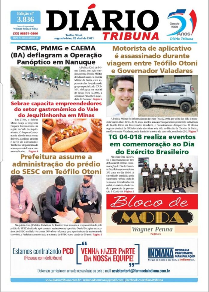 Diário Tribuna, 26 de Abril 2021, Teófilo Otoni – MG Por diariotribuna - 26/04/2021 0 803 Facebook Twitter Google+ Pinterest WhatsApp Acesse o link abaixo e veja a edição completa do Diário Tribuna desta Segunda-feira (26/04/2021) https://diariotribuna.com.br/wp-content/uploads/2021/04/DIARIO-TRIBUNA-51-ANOS-26-ABRIL-2021.pdf