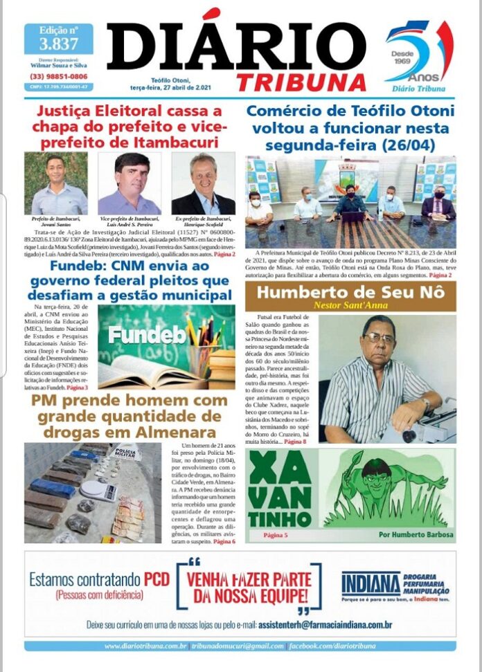 Diário Tribuna, 27 de Abril 2021, Teófilo Otoni – MG Por diariotribuna - 27/04/2021 0 571 Facebook Twitter Google+ Pinterest WhatsApp Acesse o link abaixo e veja a edição completa do Diário Tribuna desta Terça-feira (27/04/2021) https://diariotribuna.com.br/wp-content/uploads/2021/04/DIARIO-TRIBUNA-51-ANOS-27-ABRIL-2021.pdf