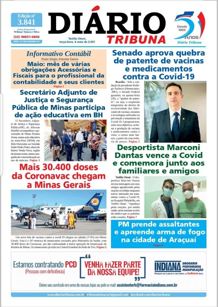 Diário Tribuna, 04 de Maio 2021, Teófilo Otoni – MG Por diariotribuna - 04/05/2021 0 596 Facebook Twitter Google+ Pinterest WhatsApp Acesse o link abaixo e veja a edição completa do Diário Tribuna desta Terça-feira (04/05/2021) https://diariotribuna.com.br/wp-content/uploads/2021/05/DIARIO-TRIBUNA-51-ANOS-04-MAIO-2021.pdf