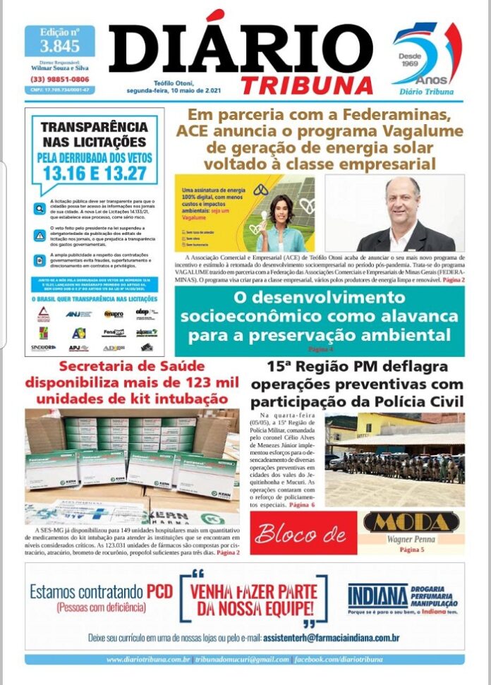 Diário Tribuna, 10 de Maio 2021, Teófilo Otoni – MG Por diariotribuna - 10/05/2021 0 772 Facebook Twitter Google+ Pinterest WhatsApp Acesse o link abaixo e veja a edição completa do Diário Tribuna desta Segunda-feira (10/05/2021) https://diariotribuna.com.br/wp-content/uploads/2021/05/DIARIO-TRIBUNA-51-ANOS-10-MAIO-2021.pdf