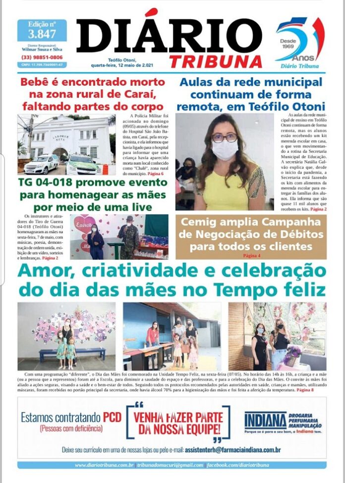 Diário Tribuna, 12 de Maio 2021, Teófilo Otoni – MG Por diariotribuna - 12/05/2021 0 849 Facebook Twitter Google+ Pinterest WhatsApp Acesse o link abaixo e veja a edição completa do Diário Tribuna desta Quarta-feira (12/05/2021) https://diariotribuna.com.br/wp-content/uploads/2021/05/DIARIO-TRIBUNA-51-ANOS-12-MAIO-2021.pdf